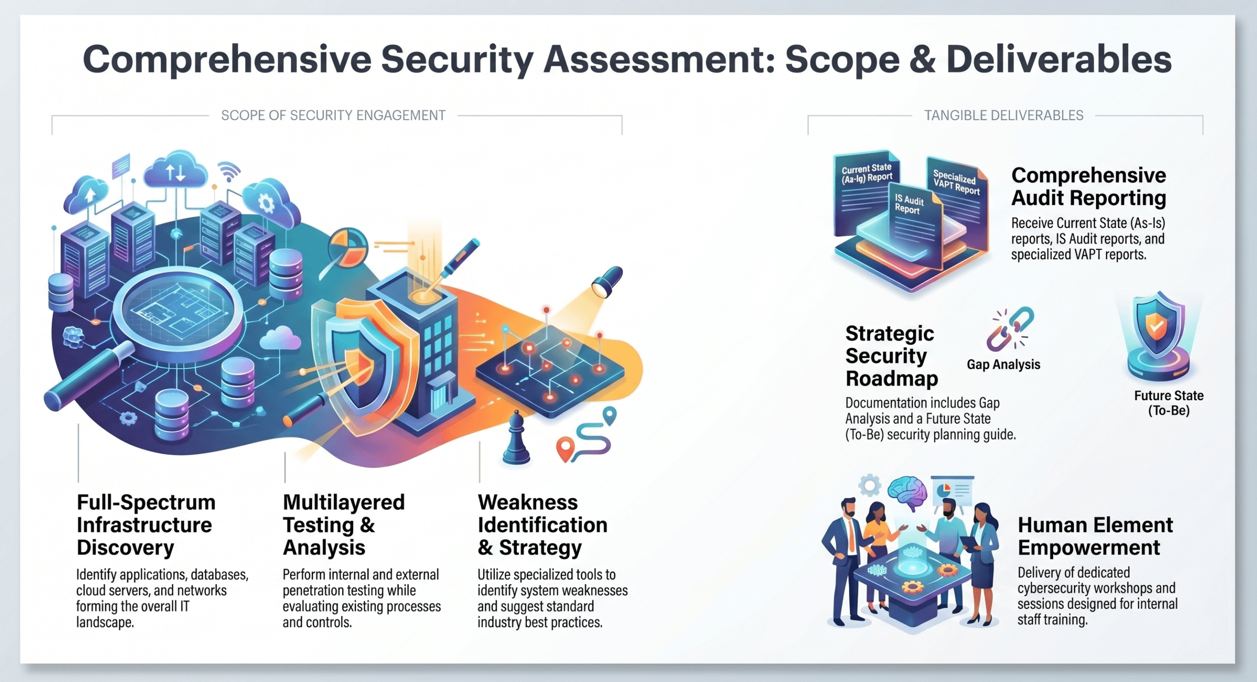 Cyberyog provide tangible written materials—including Website/Internal VAPT Reports, a Current State (As-Is) Report, a Future State (To-Be) projection, and a Gap Analysis with a Security Roadmap – leveraging their “Know Your CyberScore” methodology.